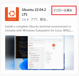 Ubuntu22.04.2 LTSを選択しました。 無料のあたりにポインタを合わせると入手ボタンに代わります。入手をクリックすると自動でダウンロード+インストールが起動しました- しばらくすると