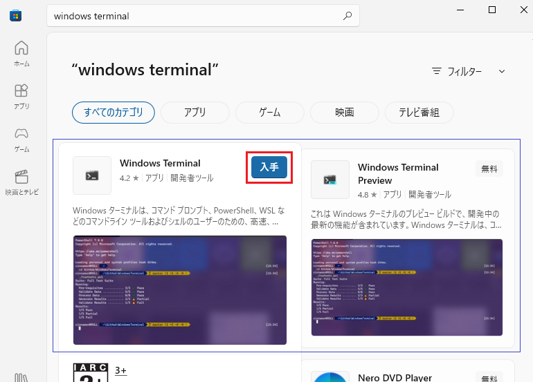 microsoft storeと入力しmicrosoft storeをクリックします。microsoft store内の検索窓でWindowsTerminalを検索します。- それっぽいアプリとして